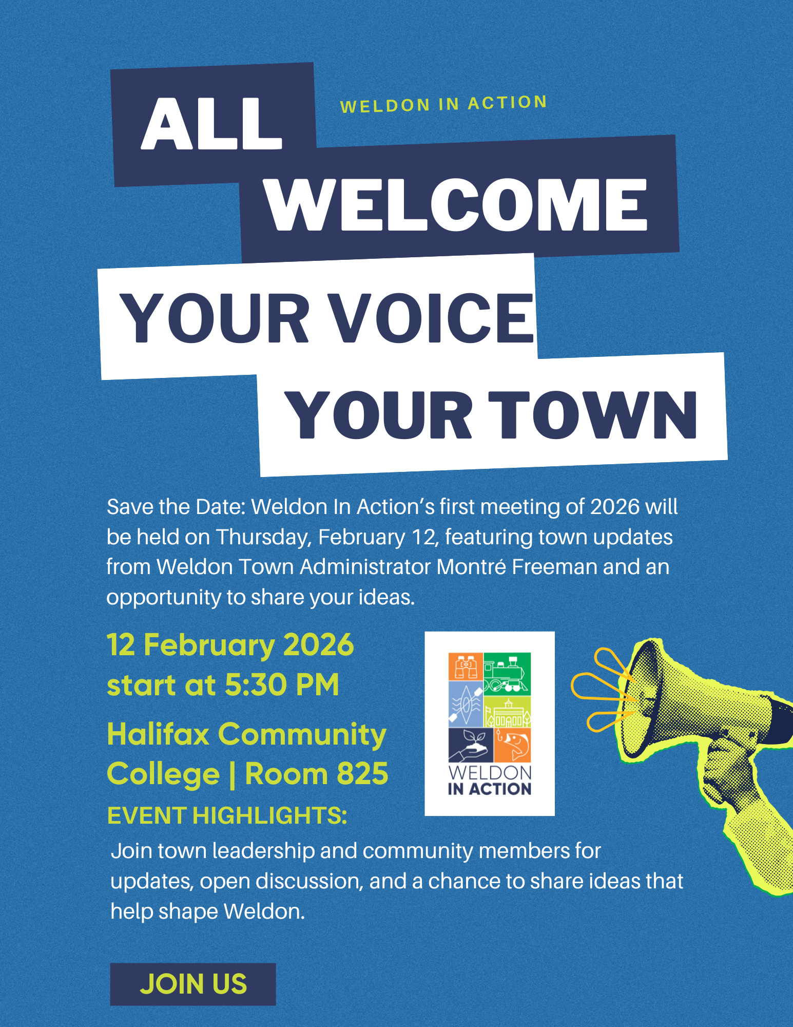 Weldon In Action invites community members to our first meeting of 2026 on Thursday, February 12, for an evening focused on civic engagement, open dialogue, and community connection. The meeting will feature town updates from Weldon Town Administrator Montré Freeman, along with an opportunity for residents to share ideas, ask questions, and engage directly with local leadership.